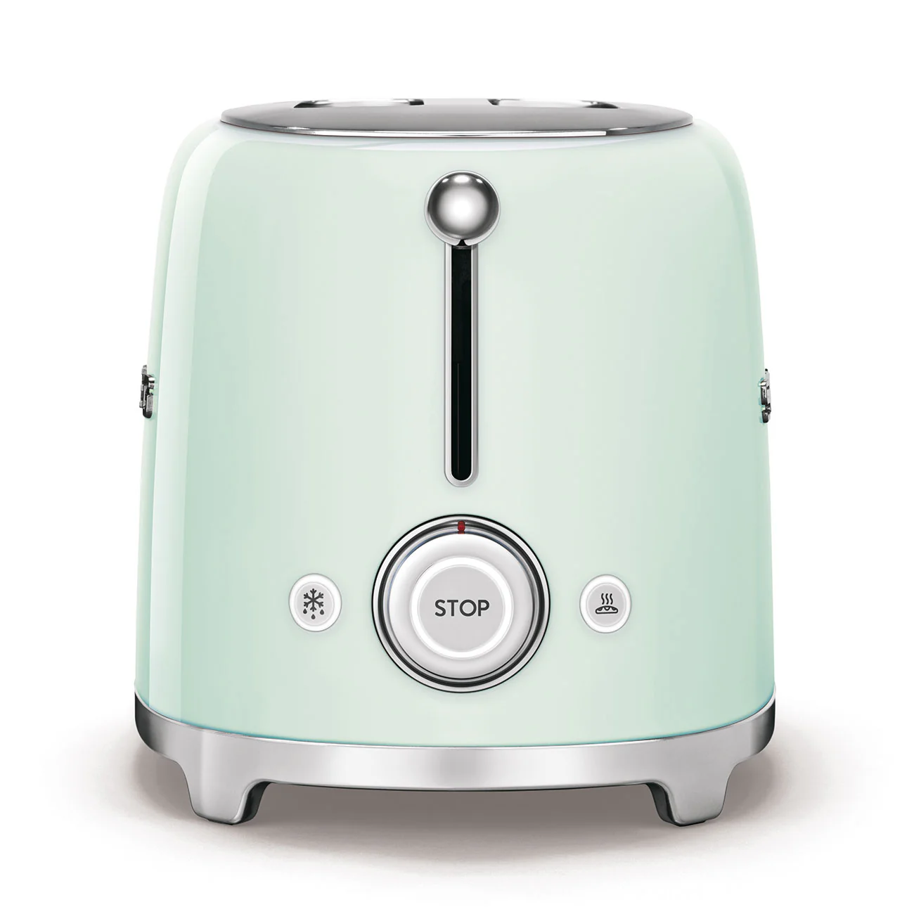| About This Product | The Pastel Green gloss TSF02 long slot toaster, in classic Smeg 50s style, has extra long slots, making it a perfect solution for a variety of bread types, easily accommodating everything from artisan sourdough to 4 slices of sandwich bread. 6 different toasting levels and functions, including defrost, reheat and bagel, plus a removable crumb tray. |